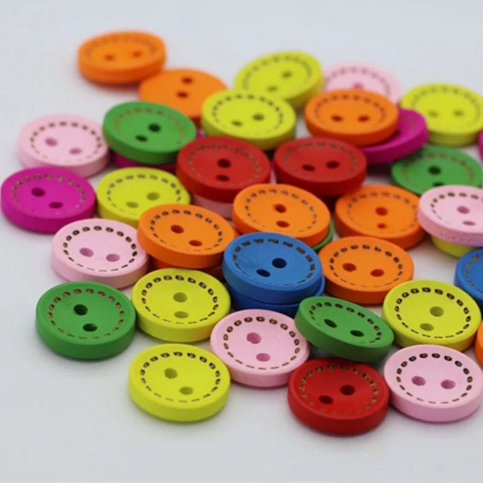 Enhance your craft projects with these charming 15mm color-dotted wooden buttons. Perfect for adding a playful touch to any design.